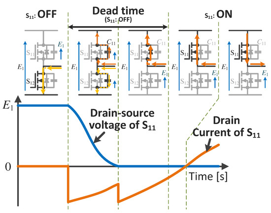 The soft-switching operation upon turning on can be achieved by turning the switch on while the drain-source (D–S) voltage across the switch is zero. In other words, in order to achieve the soft-switching operation, it is necessary that the electric charge stored in the snubber capacitor, which is connected to the switch in parallel for protecting the steep change of the D–S voltage, is discharged completely before turning the switch on. To discharge the electric charge, it is necessary to make the reverse current flows through the switch during the dead time as shown in Figure 4.