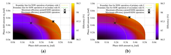 In Figure 5, the x-axis shows the phase shift amount between the legs of the primary-side active bridge [rad] and the y-axis shows the phase shift amount between the legs of the secondary-side active bridge [rad]. In each point, the phase shift amount [rad], which is between the gating signals for and , is regulated so as A. In addition, the dotted lines show the boundary lines for the operation modes of the active bridges. Inside of the boundary lines, which mean in the lower left of the map, all switches of the active bridges can achieve soft-switching (SSW) operation. However, in this paper, the operation mode where at least one of the legs in the active bridge is operated in hard switching is defined as a hard-switching (HSW) operation.