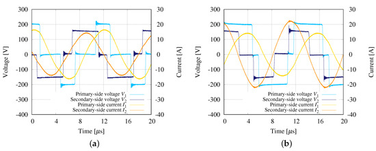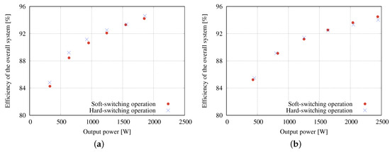 From Figure 9a, it can be confirmed that the efficiency in the hard-switching operation becomes higher than the efficiency in the soft-switching operation. The reason is that the efficiency drop is large due to the deviation of from one in the soft-switching operation. On the other hand, from Figure 9b, it can be confirmed that the efficiency in the soft-switching operation becomes higher than the efficiency in the hard-switching operation. The maximum improvement value is 0.5% when the output power is 2.4 kW. The reason is that the efficiency drop by deviation from (12) is small in the soft-switching operation when equals one. On the contrary, when the output power is low, the efficiency in the hard-switching operation becomes higher than the efficiency in the soft-switching operation. This is because deviates further from one as the output power becomes lower.