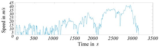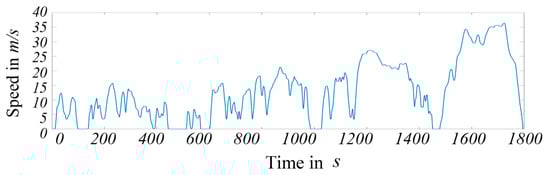 A spectrum of 20 to 30 min is ideal to obtain a representative amount of driving characteristics [8]. However, the exact length of a driving cycle cannot be set to a fixed length, since it depends on the length of the respective characteristic microtrips used in the creation of the cycle, which could vary in length depending on the regarded driving data. In order to show exemplary results, the derived driving cycle based on the recorded real driving data for the taxi drivers is illustrated in Figure 10.