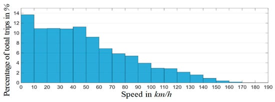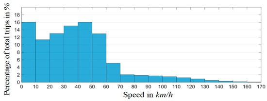 The speed profiles traveled by the recorded taxi trips could be classified into the main route types as follows: 82% city, 15% rural, and 3% motorway. Most of the taxi trips take place within the city. At 15% and 3%, respectively, the proportion of rural roads is comparatively small, while the proportion of motorways is particularly small. These values indicate that the main use of taxis is in the city or urban areas. The speed distribution of the recorded taxi trips is shown in Figure 3.