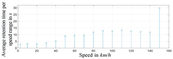 The retention times in the speed range below 50 km/h are comparatively short, i.e., they are rather “passed through” than held. This is due to the fact that the acceleration in this area is very high and the respective drivers attempt to reach the desired maximum allowed velocity quickly, e.g., after a traffic light or congested traffic. Above 150 km/h, the speed ranges are combined.