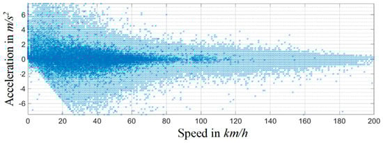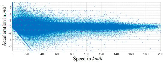 Figure 7 shows all acceleration-speed combinations for the recorded driving data of private drivers. The measured values are distributed similarly to the taxi data. With increasing speed, the acceleration decreases, but less steeply than for the taxi data. Also, the gap of the negative accelerations at low speeds is acutely more recognizable. The brighter, less frequented area is smaller than for taxi drivers. This is due to the higher speed levels for private trips, which increases the density of measuring points at higher speeds. Since the scattering of the acceleration points is smaller for private vehicles, it can also be assumed that the ownership of private vehicles leads to less aggressive acceleration behavior.