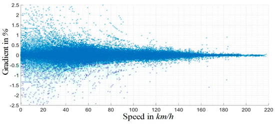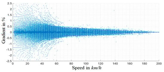 Over 64% of trips take place on a gradient of ∓0.5%, due to the circumstances in the Munich city area, where most of the data was recorded. The remaining gradients are distributed almost symmetrically around the x-axis. Thus, 7% of the journeys are still in the gradient area of ∓0.5–1.5%, as well as 3% in the gradient area of ∓1.5–2.5%. The remaining data points are distributed among the larger gradient areas. As the speed increases, the gradients decrease and vice versa.