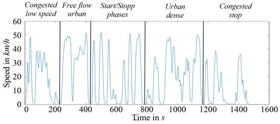 It can be seen that in regard to the classification of the ARTEMIS and the KBA, the created driving cycle mostly demonstrates characteristics of an urban or city cycle. Considering the classification used in [13], the derived driving cycle was divided into the illustrated sections. The first section from the beginning of the cycle to approximately 220 s into the cycle can be characterized as congested low-speed traffic. The following section to approximately 420 s symbolizes a version of free flow urban traffic. This section is followed by a long section with frequent Start/Stop phases, indicating a high number of consecutive traffic lights. From approx. 800 s to 1200 s; the traffic could be characterized as urban dense, followed by the last section of the cycle which represents a traffic behavior with frequent congestions and stops.
