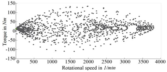 The operating points of a vehicle are individually dependent on the respective application and use case, have a direct impact on the overall machine and powertrain design and should, therefore, be considered in the future design process of electric vehicles. In the following Figure 11, the operating points of the created driving cycle for the taxi driving data are illustrated, which are determined using the machine design tool presented in [19] and a longitudinal dynamics simulation tool based on [20].