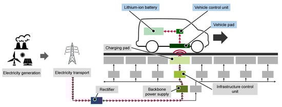 For IPTEV, the electrical energy required for long-distance mobility is constantly provided by an E|ROAD while driving. The onboard battery is therefore smaller than that of BEV vehicles, being otherwise equal to that in Figure 1. With a high degree of expansion of the E|ROAD infrastructure, the driving range is practically unlimited [8]. The implementation of the IPTEV concept requires additional infrastructure- and vehicle-related adaptations and investments compared to a BEV [8]. Essential components are summarized in Figure 2.