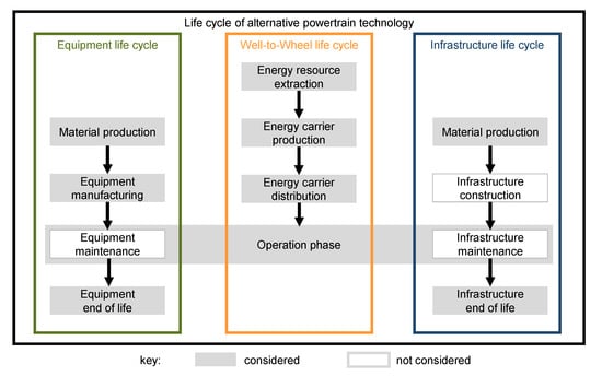 Life cycle of alternative powertrain technology including the consideration of infrastructure acc. [2].