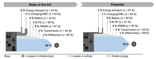 Since all considered powertrains demand electrical energy, the efficiency of the provision of the energy source “electricity” is not taken into account. For the state-of-the-art BEV, losses in energy transport on the infrastructure side therefore amount to 6% of the output energy quantity and in the charging unit at an efficiency of 85%. On the vehicle side, there are charging and discharging losses, heat losses in the power electronics, as well as losses in the electrical machine and the mechanical components of the powertrain. In the case of the BEV, this amounts to the remaining 60% of initial energy for the state of the art.