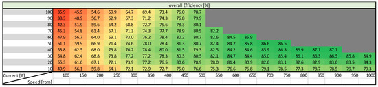 Running only a basic machine mapping, the target of up to 90% efficiency (power electronics and SRM) could almost be achieved (maximum 87.1%). A more detailed efficiency analysis will be performed in Section 6.3.