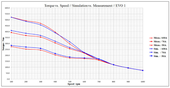 Simultaneously to the efficiency analysis a comparison of simulated and measured torque was performed and shows satisfying results. By maintaining a difference between simulation and reality of <5% in almost all working points, the finite element analysis (FEA) simulation could be validated with great confidence. Figure 4 shows the machine torque versus speed curve for three different phase currents: