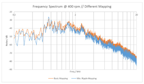 Figure 9 shows the absolute sound pressure over the complete frequency range, in orange with high torque ripple, in blue with improved switching points. Easy noticeable is a reduction over the complete frequency range. Calculating the average noise amplitude for both measurements at the same working point shows that the noise amplitude of minimum ripple mapping is reduced by −3.2 dB, by parallel adding 14% torque. Using the described working process for the noise reduction of the machine, a new “NVH-friendly” machine mapping for all working points had been developed. These maps are stored in the SRMCU and can be controlled by the bidirectional CAN display inside the car.