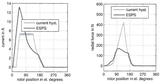 Example current waveforms at radial forces, hysteresis current control (HCC) vs. early single pulse strategy (ESPS) [8]. Reproduced from Knut, K., Analysis and Control of the Acoustic Behavior of Switched Reluctance Drives; published by RWTH Aachen, 2011.