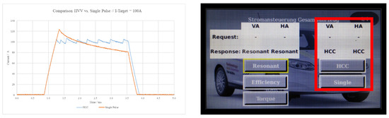 To test the acoustic influence of a single pulse control, this mode was implemented inside the PEM logic controller, and can be activated via the bi-directional display. When switching from HCC to single pulse, the upper border of the current control is increased by 20% to compensate for the lack of torque, while the switching on- and off-angles were kept identical. Figure 11 shows the available options inside the display and measured current waveforms inside one coil with a target current of 100 A.