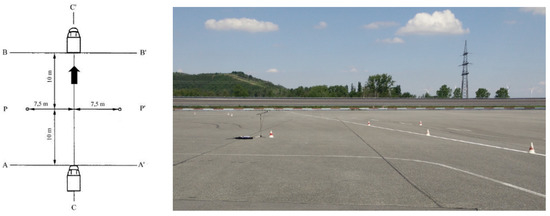 Measurement layout [9] (Reproduced from Official Journal of the European Union; published by EU-Norm, 2014) and practical test at the Aldenhoven Proving Ground.