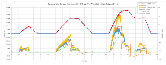 After proving that it is possible to maximise the efficiency of the WHDT, all working points had been optimized and stored at the SRMCU to be activated as “efficiency driving mode” via the display. Repeating the NEDC drive cycle the results can be analyzed in Figure 15: The new mapping marked in blue can be compared to the base mapping in yellow as well as with the original Ford Focus Electric drivetrain in orange and the theoretical needed power of a 100% efficient drivetrain in green. The new mapping showed its capability for safe energy.