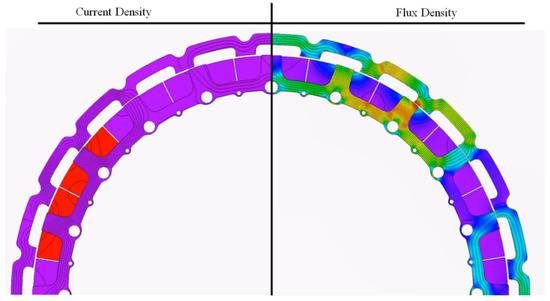 Simultaneously to the successful installation and testing of two EVO 1 machines on the rear axle, a final switched reluctance wheel hub motor for the front axle of the project demonstrator was developed. Keeping the overall goal of zero modification to the original vehicle including disc brakes, upright, and wishbones, the integration of a suitable machine turned out to be even more complex compared to EVO 1. Through the drum brake on the rear axle with a diameter of 270 mm and a 19 inch rim (diameter: 430 mm) EVO 1 had an radial installation space of 80 mm. Adapting this calculation to the front axle, EVO 2’s integration is much more complicated. The size of the disc brake with a diameter of 334 mm let the radial installation space decreases to 48 mm, which is 60% of EVO 1. Furthermore, the moving parts at the front axle suspension like lower wishbone and steering link has to be taken into consideration when designing EVO 2. Due to the limited space, the power electronics of the front axle had to be outsourced into an extra housing. From an electro-magnetic point of view, the EVO 2 drive train adapts all lessons learned from EVO 1 and thereby leads into a design with 20 stator teeth, 24 rotor teeth, outer rotor: a five phased switched reluctance machine. Figure 16 shows flux and current density when phase D and E are energised as an example operating point.