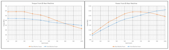 Comparing EVO 2 to EVO 1, an additional 11 kg of machine mass could be saved, which leads to a weight reduction of 22%. The torque-speed characteristic of EVO 2 was designed to match perfectly the behaviour of EVO 1 on the rear axle: Producing less launch torque at lower speeds (due to the limited installation space) EVO 2 can produce more power at higher speeds to compensate for the rear axle which performs a power drop at >700 rpm. Overall the EVO 2 drive train is even 8% more powerful, at 22% less weight. Figure 18 shows the comparison of the front and rear machines over speed.
