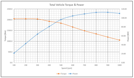The installed power and torque, using all four machines at a battery voltage level of 300 VDC can be identified in Figure 20.
