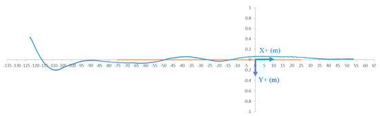 The system performances were assessed following the FABRIC methodology in many real driving conditions, with lateral misalignment between secondary and primary coils centerlines. Misalignment was calculated from the data provided by the GPS-RTK system described in Section 3.3. The positions of the car reference point (middle of rear axle) were recorded and post-processed using a standard code in java. This code converted geographical coordinates (latitude and longitude) into a Lambert 93 planar coordinate system (most commonly used for autonomous car geolocation procedures). These coordinates were converted into a coordinate system linked to the track. For practical reasons, the origin of the system was taken at the start of the last 25 m section, the x-axis matching the reference line (0 misalignment) pointing in the direction of motion during standard charge, and the y-axis pointing to the right. Figure 8 provides an example of the data generated in this coordinate system.