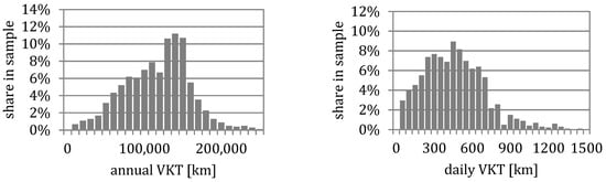 Considering the analysis of HDT in Germany, we use the data set “Kraftfahrzeugverkehr in Deutschland 2010” which is a travel survey of about 70,000 vehicles with all vehicle movements on one day of observation [19]. This data set is publicly available and the largest sample of commercial vehicle movements in Germany. Based on the size class information, we can filter for vehicles with an allowed total weight of 40 tons and arrive at N = 1018 vehicles for our analysis. We only use two attributes of the sample: the annual vehicle kilometers travelled (VKT) and the VKT on the day of observation, both reported in an accompanying questionnaire to the data collection. The annual VKT distribution is shown in Figure 1. It peaks at 130,000–150,000 km, while there is not such a clear peak for the daily VKT. This implies that vehicles are not used every day, or that the frequency of vehicle usage differs.
