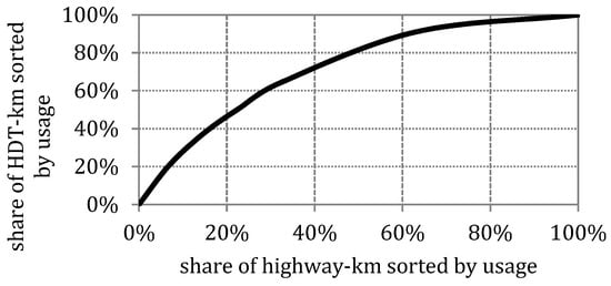 The first group of results concerns the technical potentials of electric trolley trucks. These can only drive directly with electricity if they are connected to the overhead cable. Thus, the first step is to estimate the share of kilometers driven on highways with overhead lines. Since we do not have geographical information about the driving of the vehicles, we make two simplifications. First, we use a non-linear fit for the share of kilometers on a highway based on WVI et al. [19]. Here, survey participants stated which share of their daily vehicle kilometers travelled were driven on highways and we analyzed the average share with respect to the total daily VKT. We obtain with = 127.3 km from a least squares regression of the survey data. We thus obtain the share of km driven on highways. Concerning the second step, the share of driving on a highway that is equipped with catenaries, we assume that the highly utilized highways are equipped with overhead lines first. We order the highway segments by the number of truck-km per segment within a highway and, thus, obtain stretches with very high average utilization. Figure 2 shows the resulting share of mileage of heavy duty vehicles over the share of highway kilometers ordered by their usage, based on Wietschel et al. [3]. Thus, if the most frequented 20% of highways had overhead lines, almost 50% of the mileage of heavy duty vehicles would be electrified. The product of the share, if driving on a highway and of driving on a highway with catenaries , results in the overall share of kilometers driven electrically .
