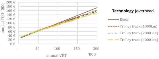 Here, the economic evaluation of trolley trucks is based on TCO analyses for the individual annual VKT (cf. methods section). The first major economic result is that overhead line trucks with a diesel engine as a hybrid component can be an economically viable solution for a large fraction of HDTs. However, this does not include the costs for constructing the overhead power lines and assumes the lines are used to capacity. Other studies come to a comparable result in this respect [6,7,25,26]. The TCO for trolley trucks, however, depend on the amount of overhead line infrastructure. We show the TCO for diesel vehicles as well as diesel trolley trucks with three different amounts of overhead line infrastructure in Figure 3.