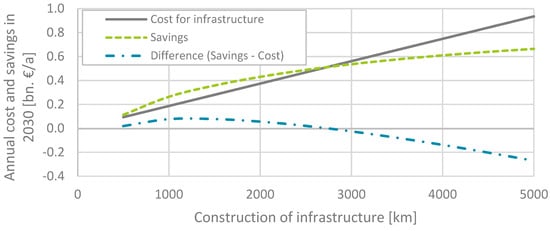 Assuming an infrastructure of 4000 km in 2030, we find approximately 25% of the heavy-duty vehicle stock (approximately 50,000–70,000 trucks) could be trolley trucks by 2030. Yet, the time needed to construct infrastructure, develop and build trolley trucks and replace existing trucks should not be underestimated. The cost for the catenary infrastructure has been assumed to be 2.2 m EUR/km [3]. Investments in the overhead line infrastructure would thus amount to approximately 8–10 billion euros for this case. The question is whether this overhead line infrastructure can create enough savings to cover its own cost. We show the annual cost for additional overhead cable infrastructure and the savings from the usage of trolley trucks in relation to the length of the overhead lines infrastructure in Figure 4 in 2030.