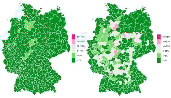 Viewing a local level, electric trolley trucks lead to an increase of electricity demand during driving hours in areas around the electrified highways. Figure 5 shows the change of local annual electricity demand on the NUTS-3 level in Germany, with respect to a reference evolution. The left panel shows the relative change in a market scenario with 1000 km of overhead lines, the right panel for 4000 km. We find only slight increases on the local energy demand in the 1000 km case, while there are a few more regions with a 20–50% raise in energy demand for 4000 km. These especially occur in rural areas with high highway usage, especially at highway junctions. Overall, the impact on the energy system is lower than for other new technologies and seems manageable.