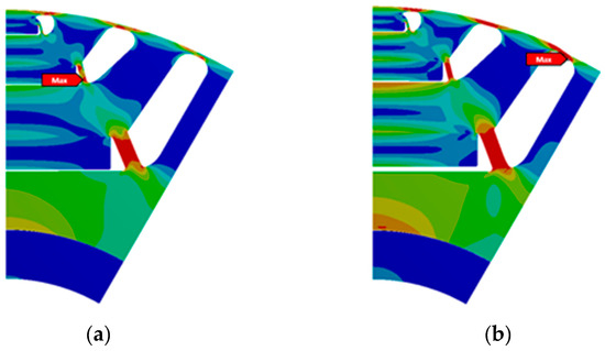 Equivalent (von-Mises) stress at (a) rated speed of 22,500 rpm and (b) over-speed of 27,000 rpm for the sintered magnet rotor.