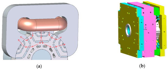 As the mechanical strength of bonded magnets is lower than of sintered magnets (flexural strength 52 MPa vs. 285 MPa [9,10]), centrifugal forces are a serious issue. Hence, a mechanically stable rotor geometry was developed for which the calculated power and efficiency of this injected magnet rotor are comparable to the sintered magnet one. Magnetostatic finite-elements calculations were performed in order to design a magnetizer tool to produce the proper magnetic field in the rotor cavities during the injection process. The principle of magnetization of the permanent magnet material is illustrated in Figure 4a. A particular effort had to be made in order to comply magnetic requirements with mechanical constraints in the design of the mold: the magnetic field needs to be produced as homogeneously as possible in all the cavities simultaneously because injection must occur in all the magnetic poles at once in order to preserve the rotor integrity. The rotor also needs to be tightly maintained from all sides during the injection, but has to be released for extraction. A complete design of the mould has been issued (Figure 4b) and is now being realized. The main dimensions of the tool are 650 × 500 × 354 mm for a rotor segment with only 117 mm diameter and 30 mm height. First injection experiments in rotors are planned for the beginning of 2020.