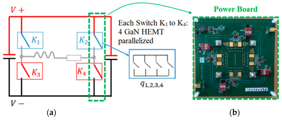 In order to obtain the required torque of 150 Nm in the six-phase high-speed motor, a current of 225 A (rms) per phase is requested. Each phase is independently connected to a full bridge in which each of two switches is realized with four parallelized GaN devices, specified in [11]. The topology of the full bridge is depicted in Figure 6a with each switch (K1,2,3,4), realized by four GaN devices in parallel. A first power board prototype of one leg of the bridge is shown in Figure 6b.