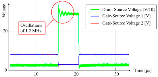 Hardware development started with the parallelization of two devices. The experimental waveforms in Figure 7 show the results for two parallelized GaN devices with at a double pulse test with an inductive load (). As shown, the switching of the two devices is synchronous, which is essential to maintain an equal current in the two of them. Moreover, oscillations on the DC bus at a frequency of approximately 1.2 MHz can be observed, which were induced by an exchange of reactive energy between the required decoupling capacitors.