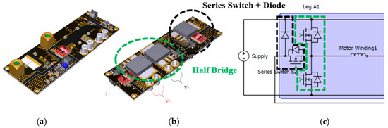 (a) Top side of power PCB with GaN device; (b) bottom side; (c) electrical circuit of one leg.