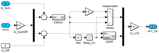 Due to the reconfiguration, the system order changes during operation: in the series mode, only one current per phase needs to be controlled, but in the independent mode, two currents have to be regulated. The resulting control method for one phase is depicted in Figure 11. As shown, the switching on/off of the Difference Current controller (by definition zero in the series configuration) is governed by a binary signal derived from the output of the Sum Current controller (the desired winding current): once the demanded voltage for the series connection becomes too large in view of the DC link voltage, the configuration is changed to independent, the Difference Current controller is enabled, and the controller gain halved in order to avoid a transient in its output due to the changed load configuration.