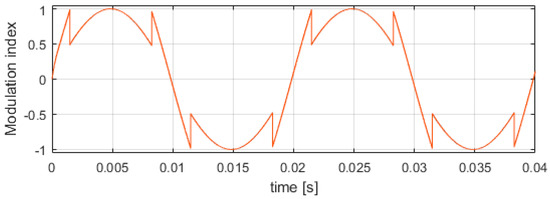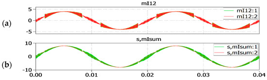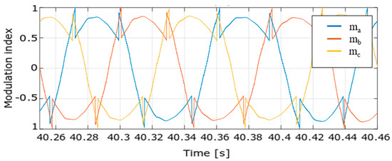 Here, the circuit is generating a sine wave voltage across one winding pair. As shown, once the modulation index for the series connection reaches 1 or −1, the configuration is changed to independent and correspondingly, the modulation index used to generate the PWM signals is halved. Once the resulting index drops below 0.5, the series configuration is restored. In the implementation, a hysteresis between the value of the modulation index that triggers the series and independent operation can be applied to avoid ringing between series and independent operation command in the control system. The shape of the individual currents in a similar situation is shown in Figure 13. It can be seen that each current follows the set-point and the ripple of the sum current remains low in both the series and independent configurations.