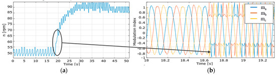(a) Acceleration of the permanent magnet synchronous machine (PMSM) from 50 rpm to 90 rpm; (b) the resulting modulation index during acceleration.