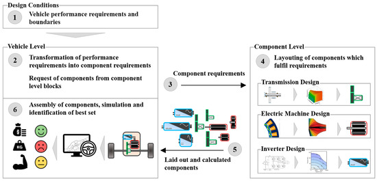 In the first step, the requirements on vehicle level (e.g., acceleration from 0 to 60 km/h in 3.9 s) are broken down to component level (1 and 2). This results in a set of component requirements such as torque, power, gear ratio, etc. (3). The component level calculation blocks layout and design components to fulfil the requirements and return the results (4 and 5). The components are virtually assembled and the performance on system level is evaluated through numerical and analytical vehicle simulations. By weighting different design criteria, such as costs, performance, and weight, the best set of components for the specified target vehicle is found (6). As this study is ongoing and targeted to be completed in the beginning of 2020, no resulting drive module specification can be shown yet. However, the outcome of this design study is not only a suitable specification for drive modules for the Volvo C30e, but also to give insights into the component interaction between electric machine, inverter and transmission. The following findings have been gained to date during the development and usage of the presented design environment: