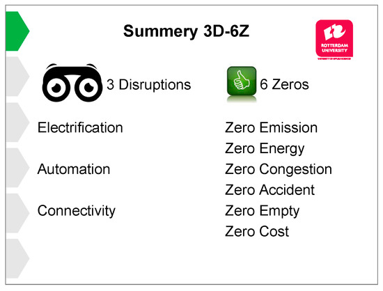 Figure 7 shows the technology disruptions—electrification, automation, and connectivity—in relation to Six Zeros: Zero Emission & Zero Energy, Zero Congestion & Zero Accident, and Zero Empty & Zero Cost.