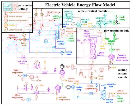 The EV energy flow model includes three modules: a vehicle control module, a powertrain module, and a cooling system module, as shown in Figure 1.
