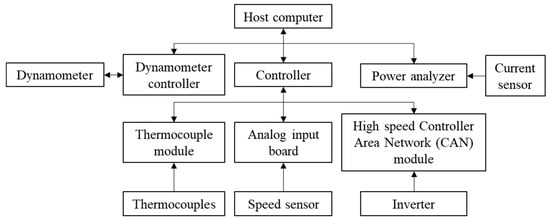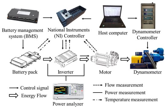 The powertrain module is the test object, including the battery pack, the motor, and the inverter. The cooling module is used to cool the EV powertrain, which contains two independent liquid-cooled circuits—one is used to cool the battery pack, and the other is to cool the motor and inverter—and the coolant flows through the motor and inverter in sequence. The bench control module includes the BMS, controller, host computer, and dynamometer controller to regulate the battery charge/discharge, data acquisition, and dynamometer loading. The data acquisition module is composed of temperature sensors (a thermocouple), flow sensors, a power analyzer, a dynamometer, etc., and is used for measuring key parameters of the system, such as the temperature and current of the battery pack. The dynamometer is needed to load the EV powertrain. The data acquisition scheme is shown in Figure 4. The main measured parameters, used instruments/sensors, and the experimental uncertainties are summarized in Table 7.