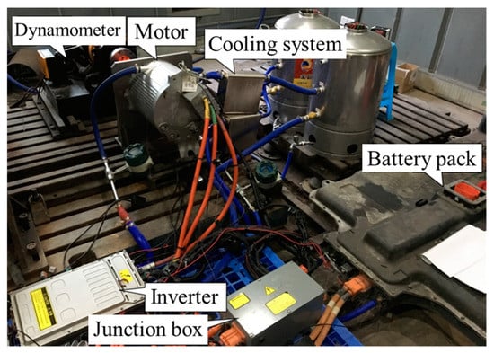 The EV powertrain test bench consists of the following four modules: a powertrain module, cooling system module, bench control module, and data acquisition system module. A graphical illustration and picture of the bench are shown in Figure 2 and Figure 3.