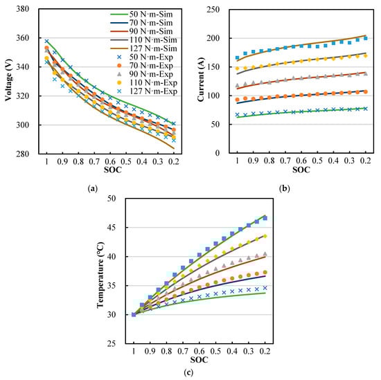 The initial and operating conditions in the EV energy flow model were set to be same with the test cases, and then the simulations were carried out. The simulated results, such as battery current, voltage, and temperature, were compared with the experimental data and are shown in Figure 5. During the charging process, the battery current was a constant (8 A) for most of the time (except the constant voltage period) and the temperature had little change, so the charging data are not plotted. It can be seen that the simulated results were close to the experimental results, and the deviations indicated that the simulation model was reliable and could be used for further calculation.