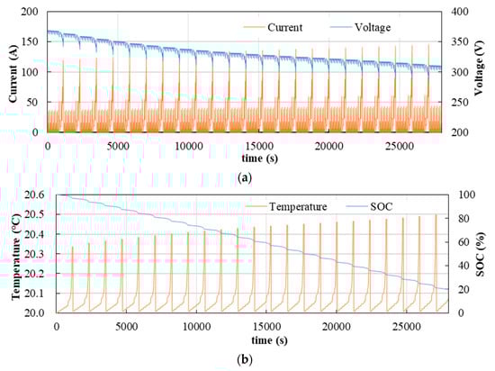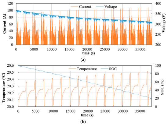 (a) The current and voltage and (b) temperature and SOC profiles of the battery pack under continuous JC08 cycles.
