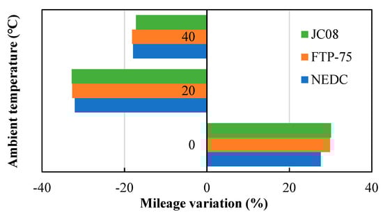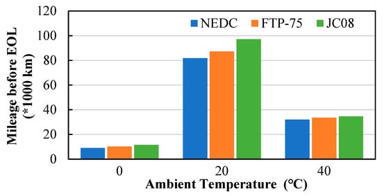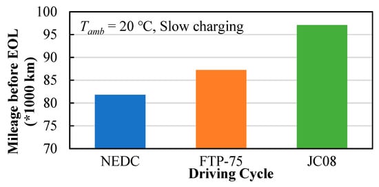 In this paper, Ф was taken as the evaluation index, and the calculation results of the NEDC, FTP-75, and JC08 cases are plotted in Figure 9. It can be clearly seen from Figure 9 that there were significant differences in Ф under different driving cycles, among which Ф in JC08 was the longest and was 18.7% higher than the lowest NEDC condition. This is because the maximum speed was lower under the JC08 cycle, which led to a lower discharge rate than that of the other two cycles. It is worth noting that the battery pack temperature did not reach 24.4 °C under all three driving cycles, at which the battery had the lowest capacity fade rate. Therefore, the higher temperatures under the NEDC and FTP-75 cycles may lead to a higher capacity fade rate. However, Ф in the JC08 cycle was actually the longest, which indicated that the higher discharge rate under the NEDC and FTP-75 cycles outweighed the impact of the temperature.
