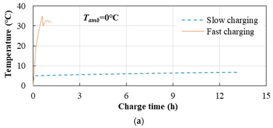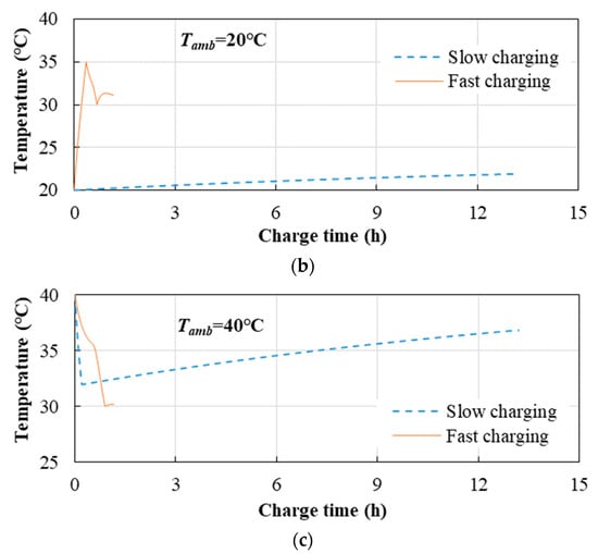 The battery temperature during fast charging and slow charging at different ambient temperatures: (a) Tamb = 0 °C; (b) Tamb = 20 °C; (c) Tamb = 40 °C.