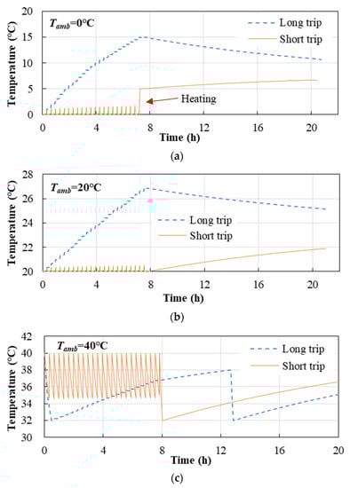 The battery temperature during short trip driving and long trip driving at different ambient temperatures: (a) Tamb = 0 °C; (b) Tamb = 20 °C; (c) Tamb = 40 °C.