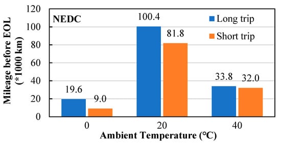 As long trips can increase the temperature of the battery pack to a higher level with a slower aging rate, Ф was enlarged, as shown in Figure 14. In the low-temperature environment (corresponding to the ambient temperature of 0 °C in this study), Ф for the long trip condition was 2.2 times that of the short trip condition. In the 20 °C cases, long trip driving can also enlarge Ф by 22.8%. At the ambient temperature of 40 °C, it can be seen in Figure 13c that the battery temperature started to decrease right after the start of driving. In the charging period, the battery temperature remained within the range of 32–38 °C, which was attributed to the BTMS and its control strategy (presented in Table 5). A lower average temperature of the battery pack was achieved by continuously working the BTMS in long trip driving, and the Ф in long trip driving was extended by 5.7%, as shown in Figure 14.