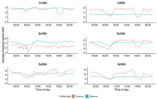 The smart charging profile of Flexpower imposes a limit on the charging current in the evening (between 17:00 and 20:00) and morning time (07:00–08:30) which directly affects the charging speed (in comparison to the reference charging stations where the current remained 25 A). Flexpower provided a higher current limit of 35 A (compared to 25 A on reference stations) during the remaining hours. To investigate the impact on the effective charging speed of the six different vehicle categories as defined in