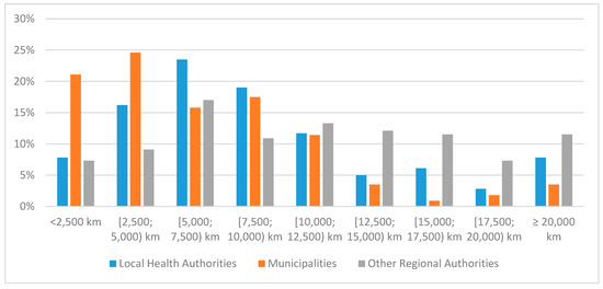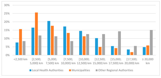 To account for the fact that vehicles have different ADTs as illustrated in Figure 2 and Figure 3, we calculate and report in Table 5, for each distance class, the average distance within each class and estimate the corresponding TCO/km. In the case of Local Health authorities, for instance, the passenger cars belonging to the 0–2500 km distance class travel on average 1244 km per year. Similarly, we estimate the average distance for each distance class, which might differ among the three groups of agencies. We use these average ADTs in the TCO model to estimate the corresponding TCO/km for the average BEV and the average ICEV.